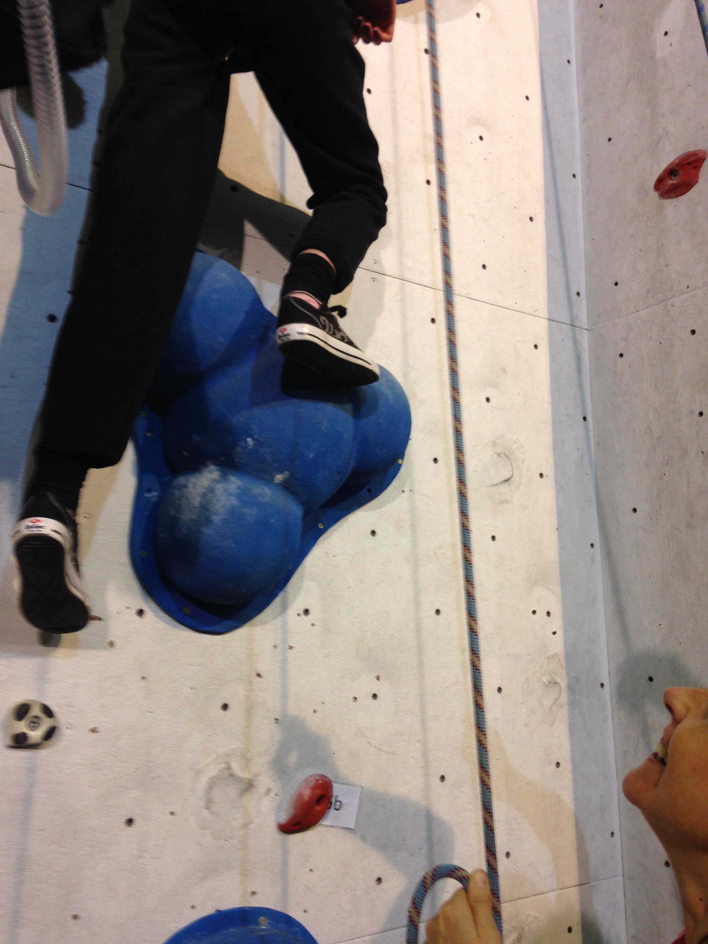 And then a bit higher… Then, surprise! Clare’s leg is lifting up onto one of the big blue bulgy protusions … she’s trying to push up with her feet!