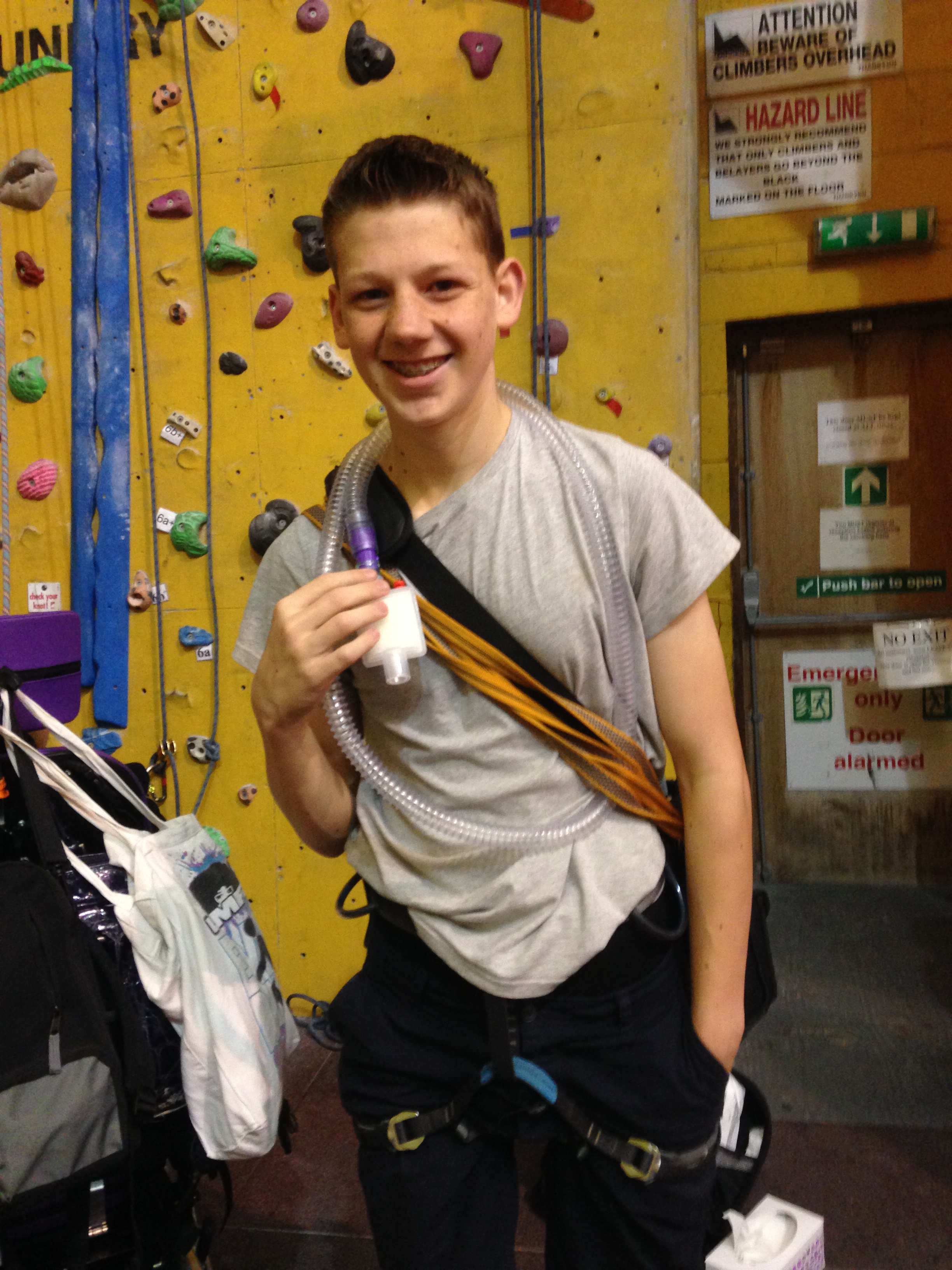 Robin uses momentum to keep Clare on the wall, and Clare finds herself holds. Looking good!Great climb! But strangely the speaking valve has fallen off unnoticed again, and this time we can’t find it anywhere. Time for the Swedish Nose – handy to keep the trache covered, though not good for audibility.