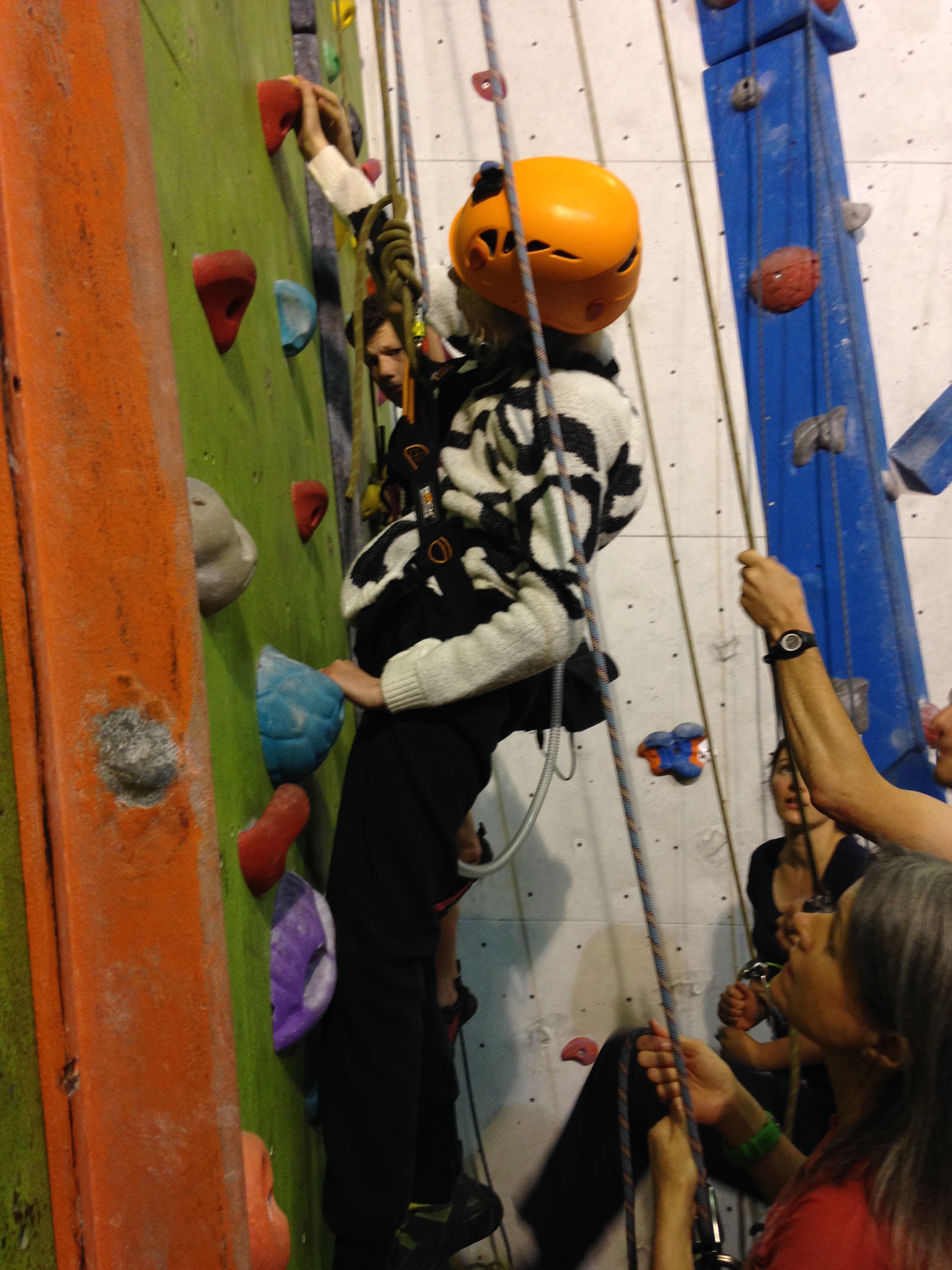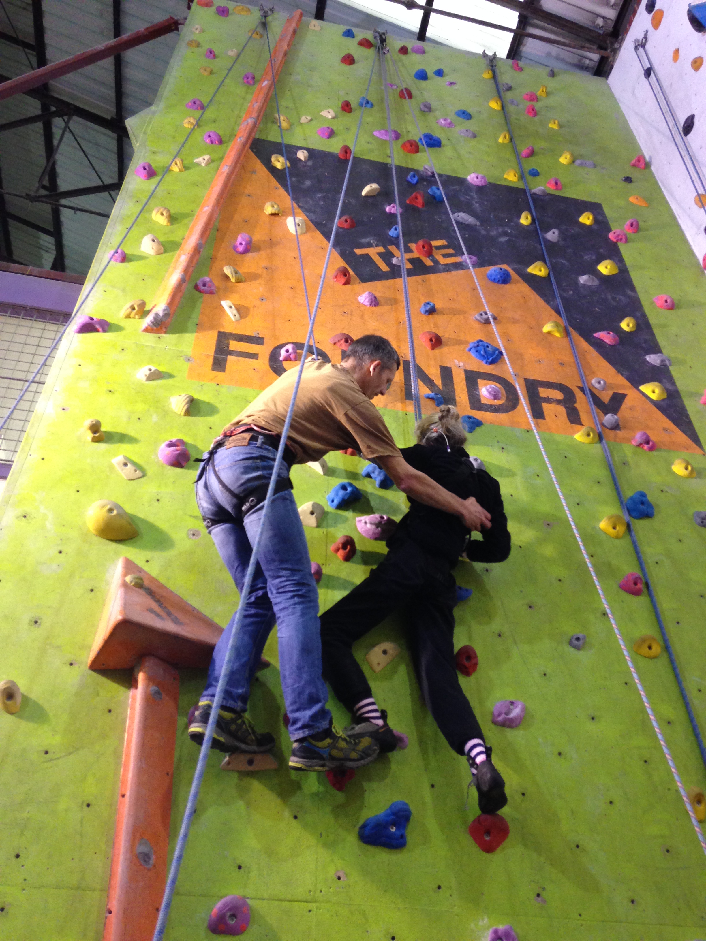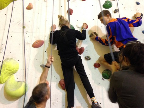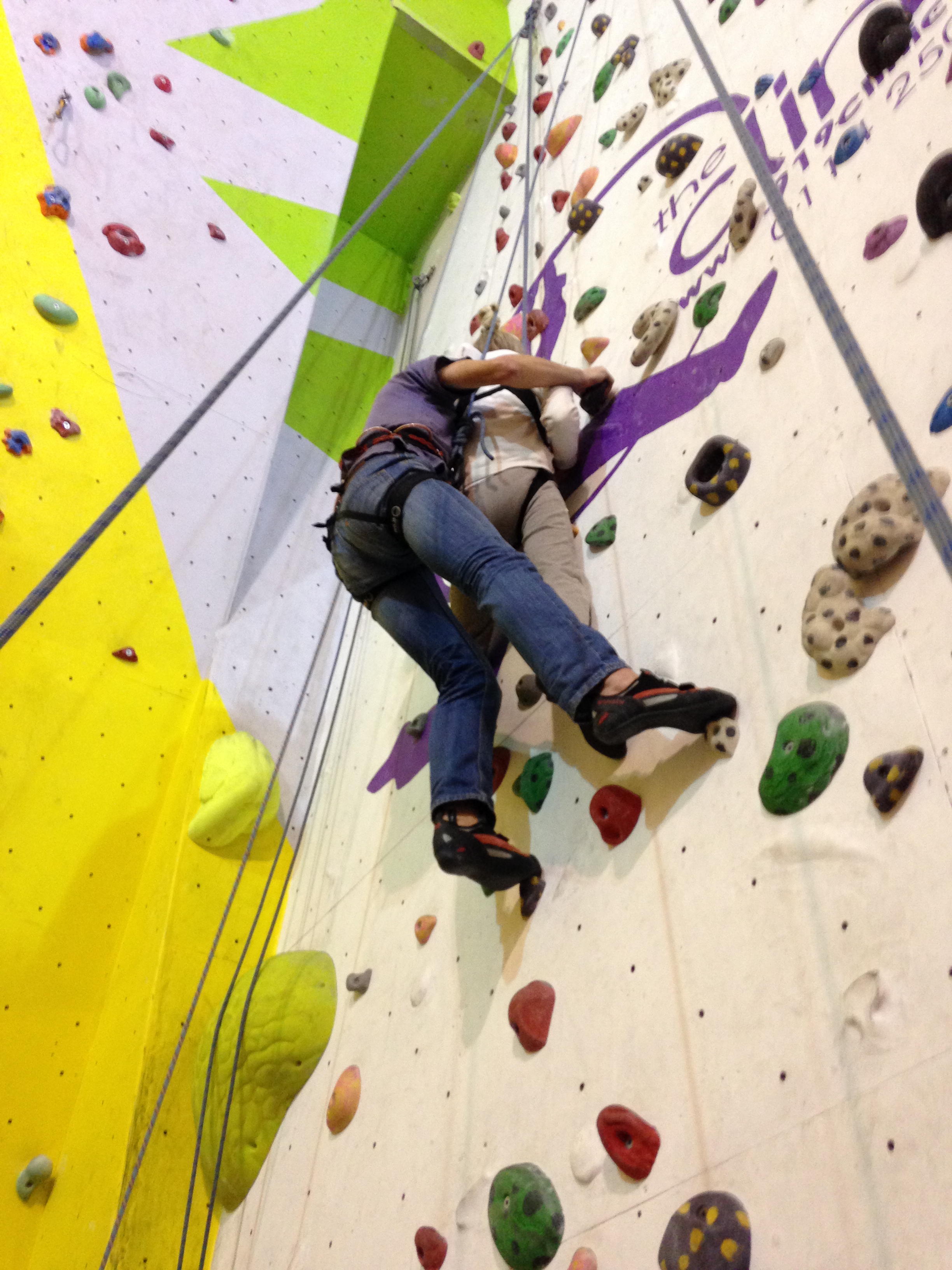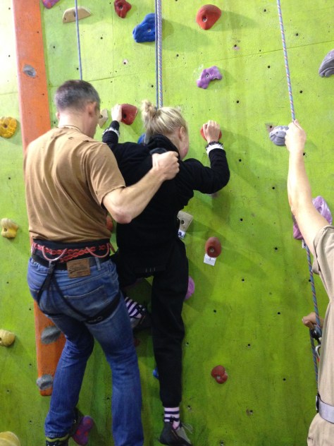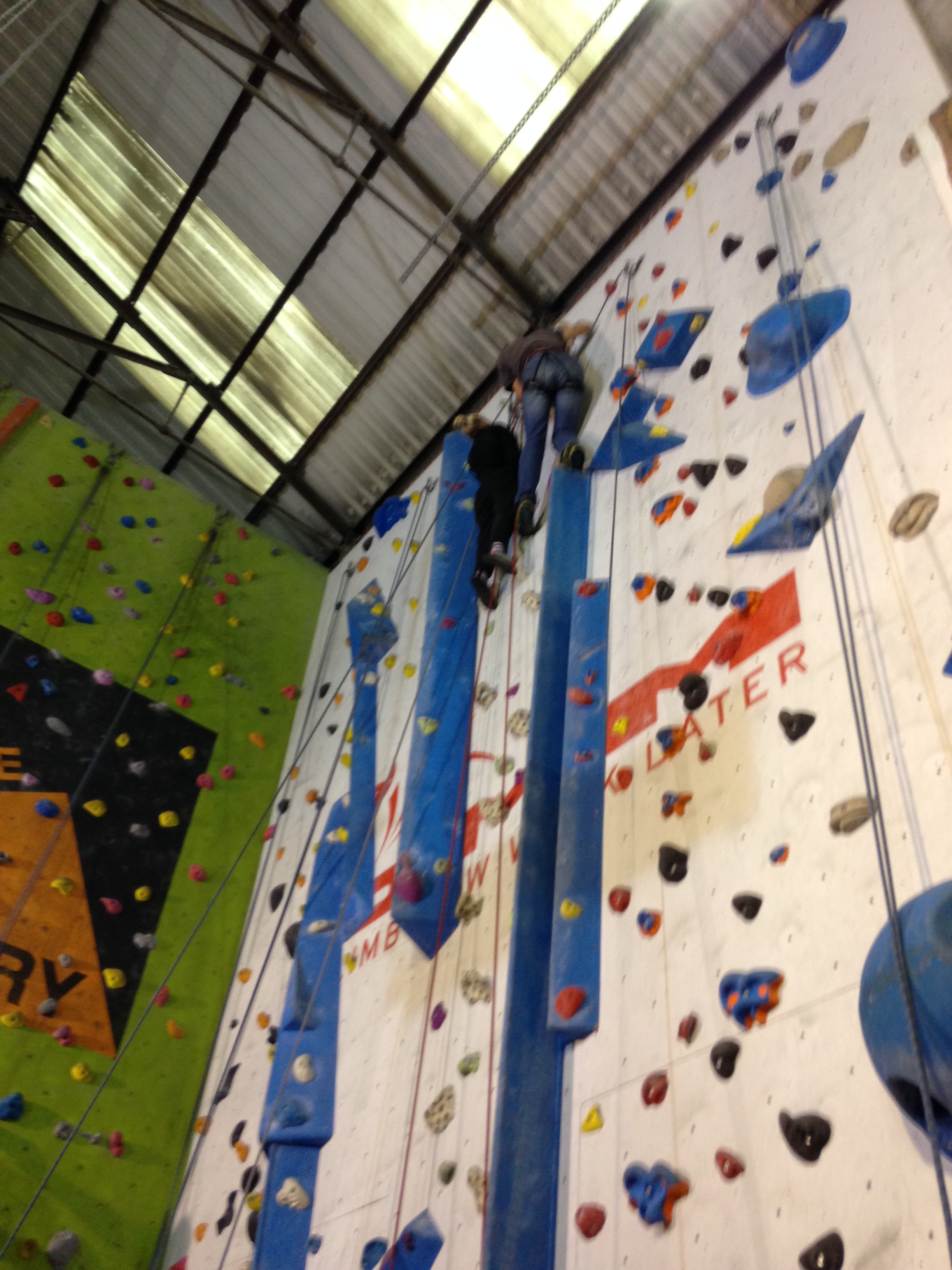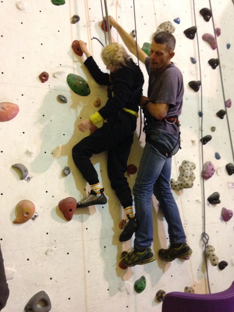 Hazel is at Laserquest with friends, so I wear a harness and take the pulley rope. Robin climbs with Clare, and Nick & Helen are belaying. Carer Ade takes my iPhone and captures the ‘getting on wall’ start to the climb.IMG_6982IMG_6984