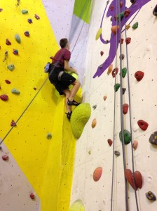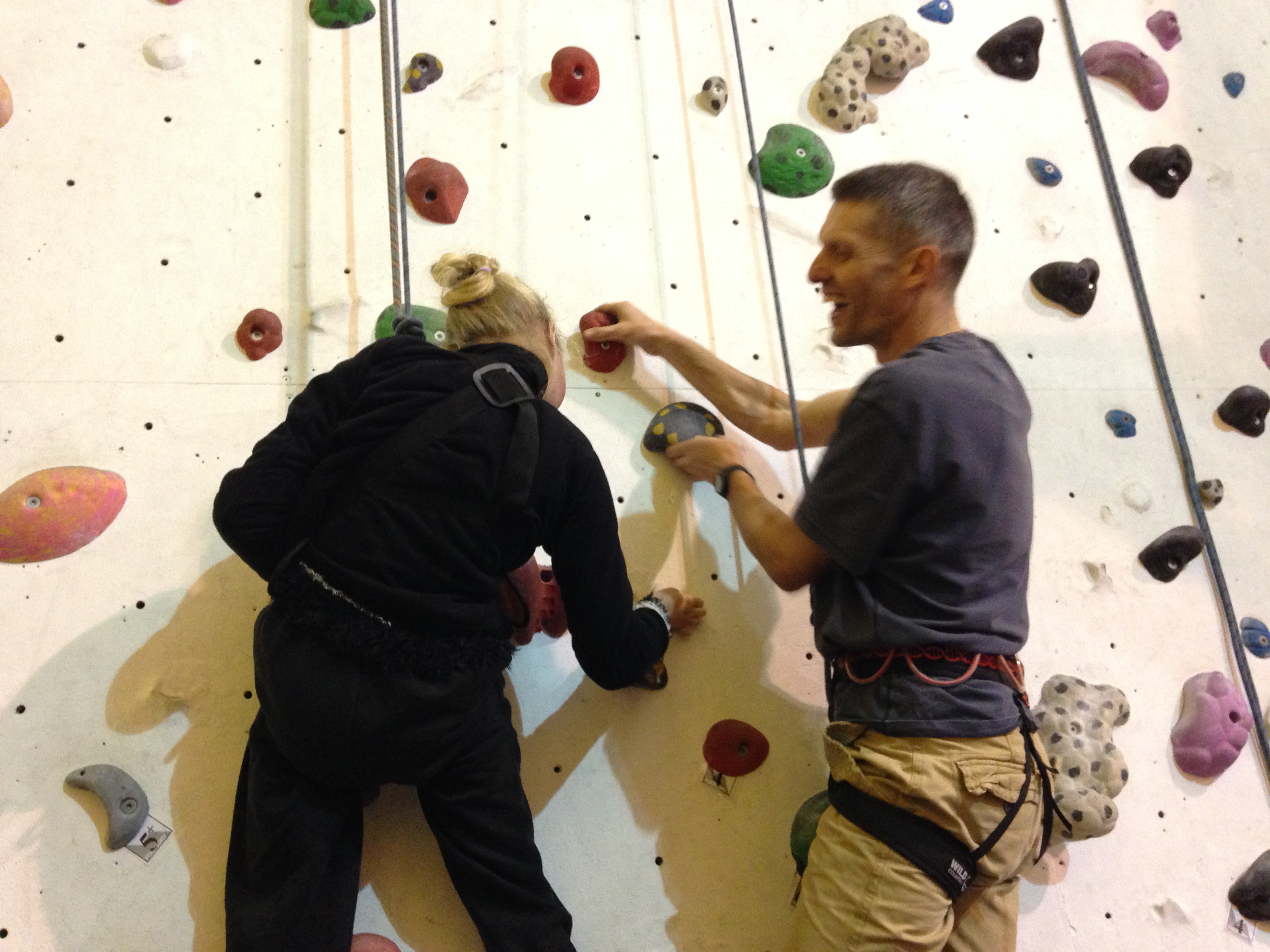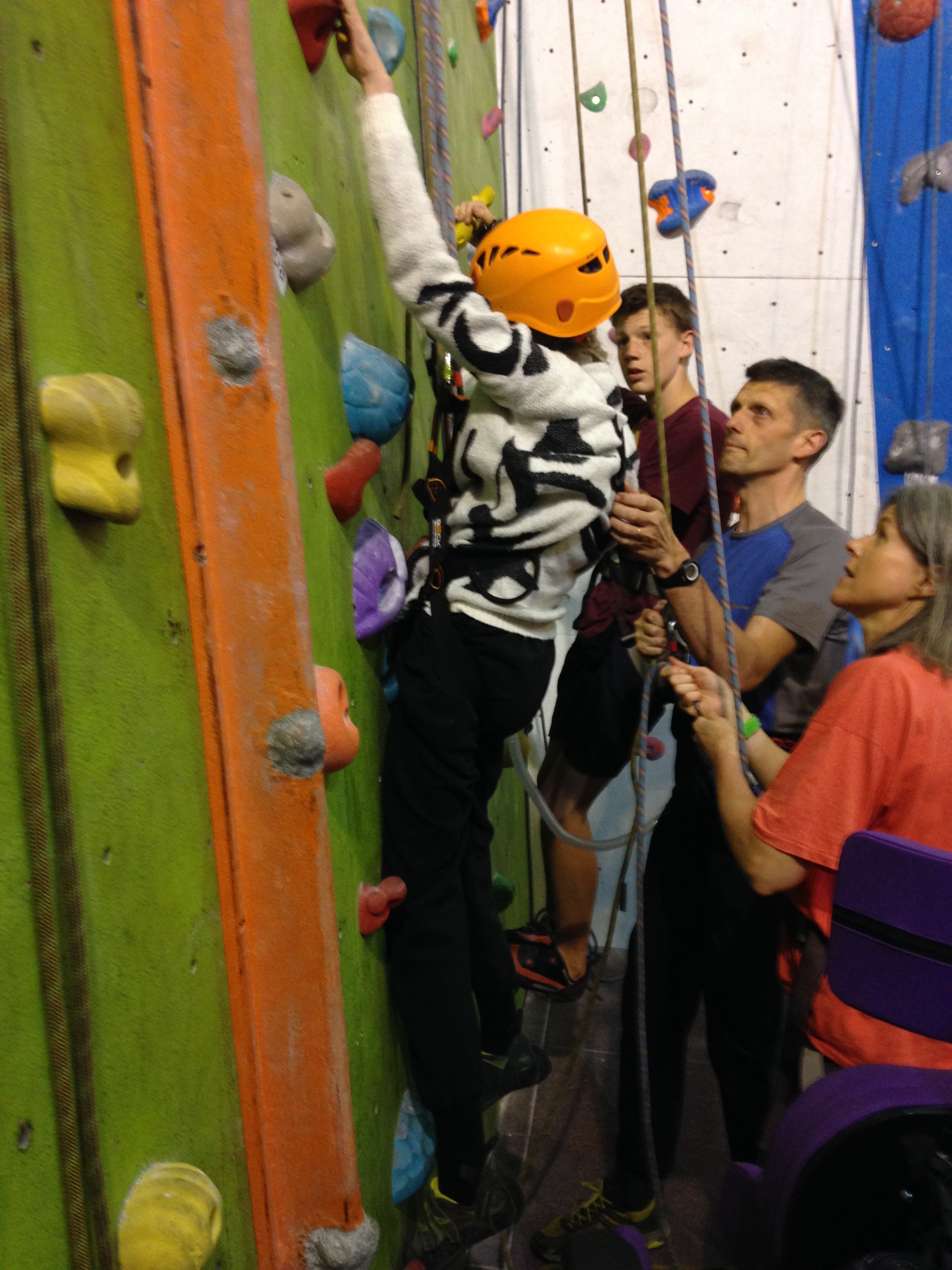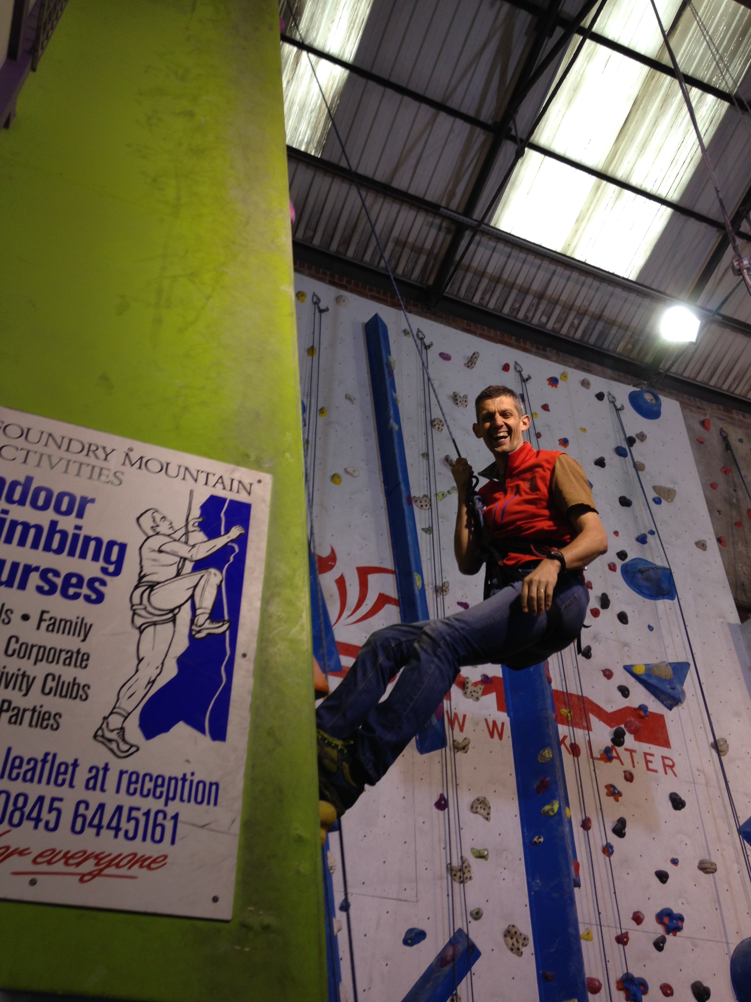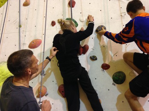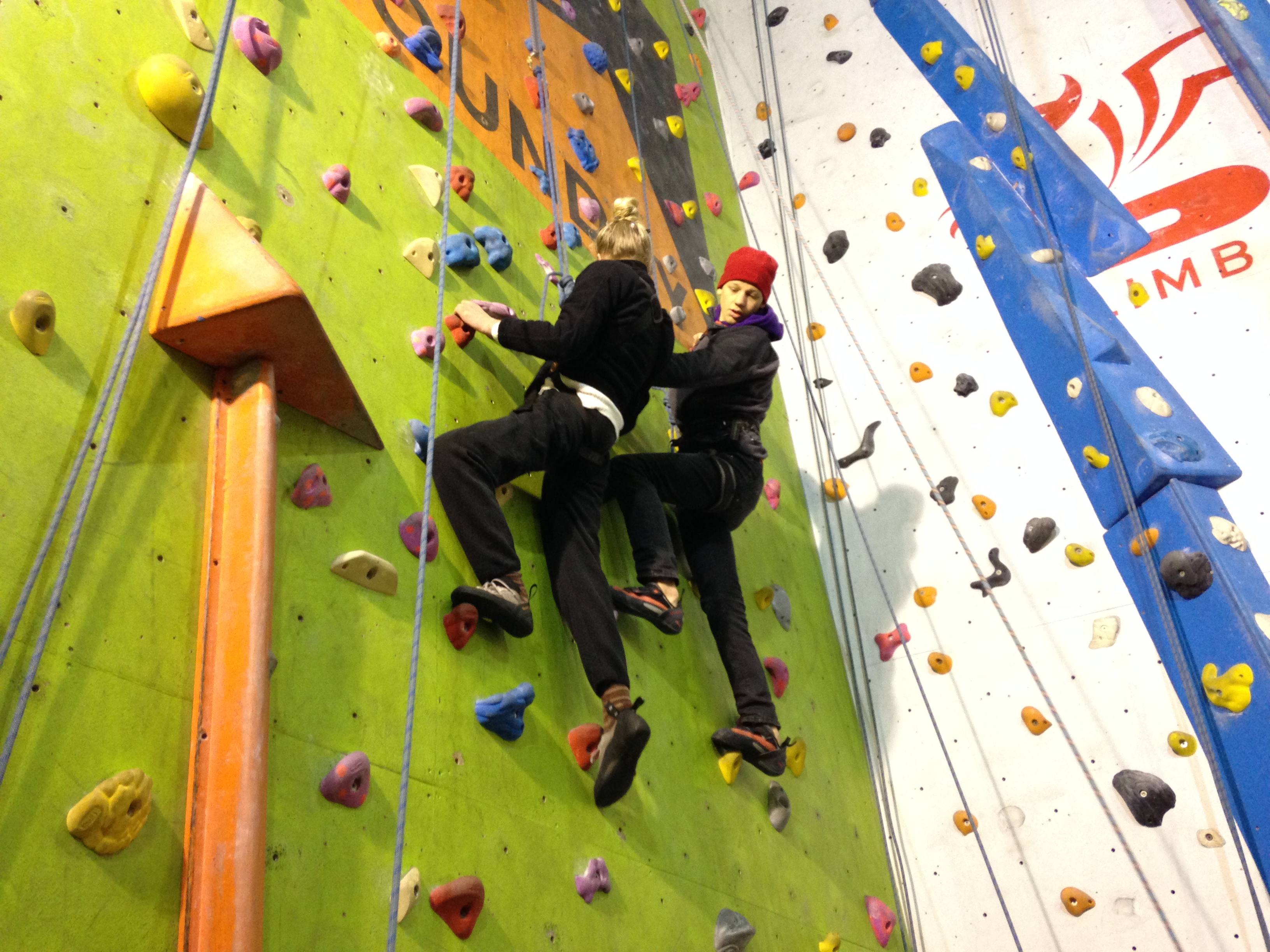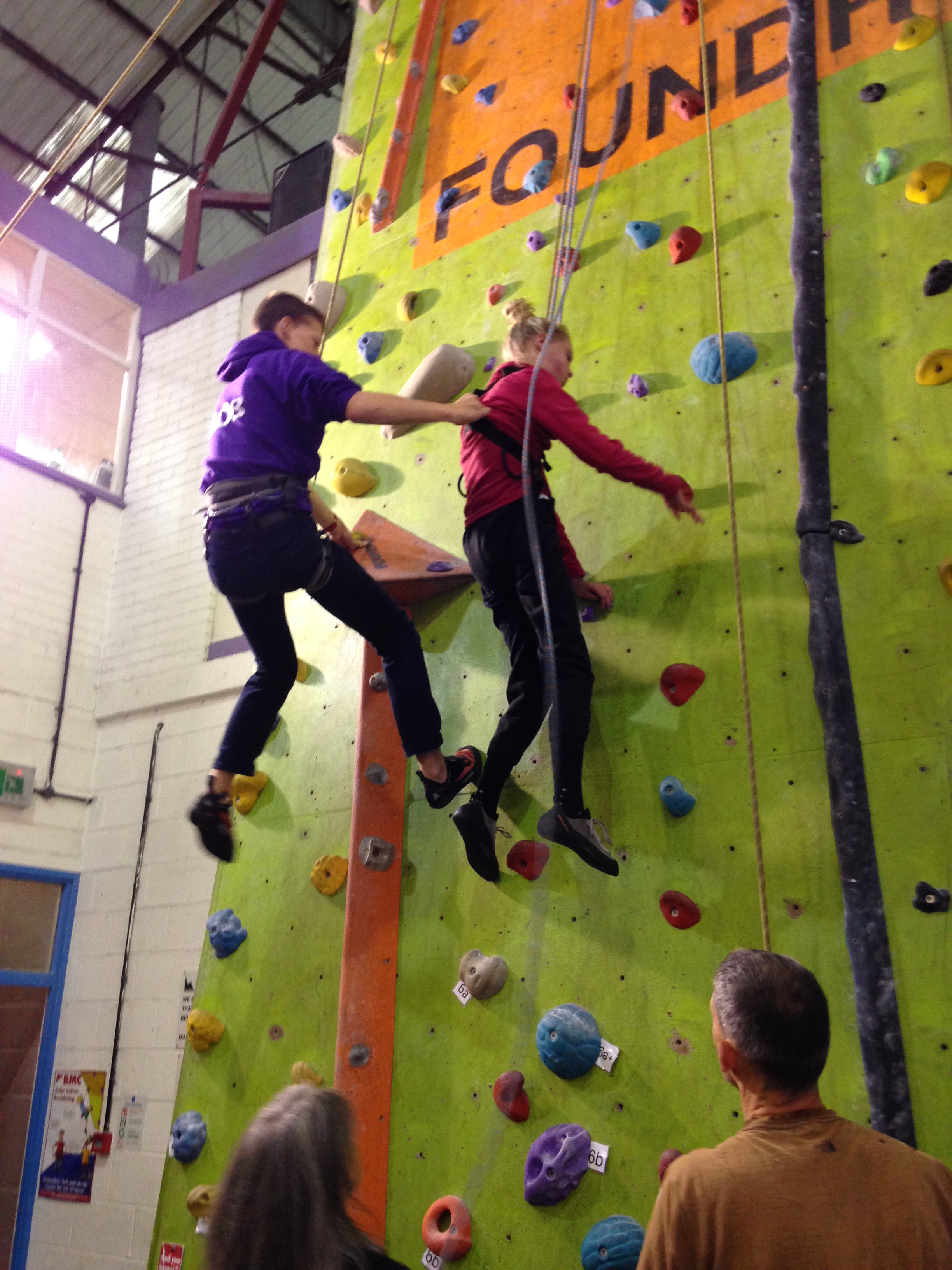 Hazel is at Laserquest with friends, so I wear a harness and take the pulley rope. Robin climbs with Clare, and Nick & Helen are belaying. Carer Ade takes my iPhone and captures the ‘getting on wall’ start to the climb.IMG_6982IMG_6984