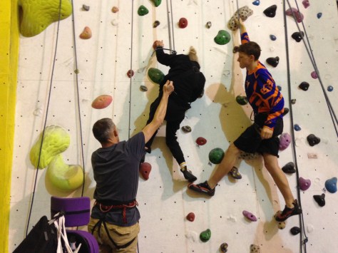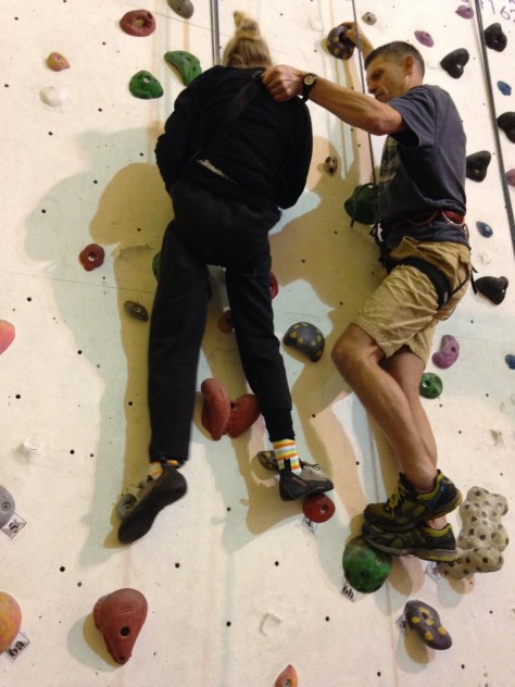 Hovering.  Encouragement.  “Reach up for the karabiner!”