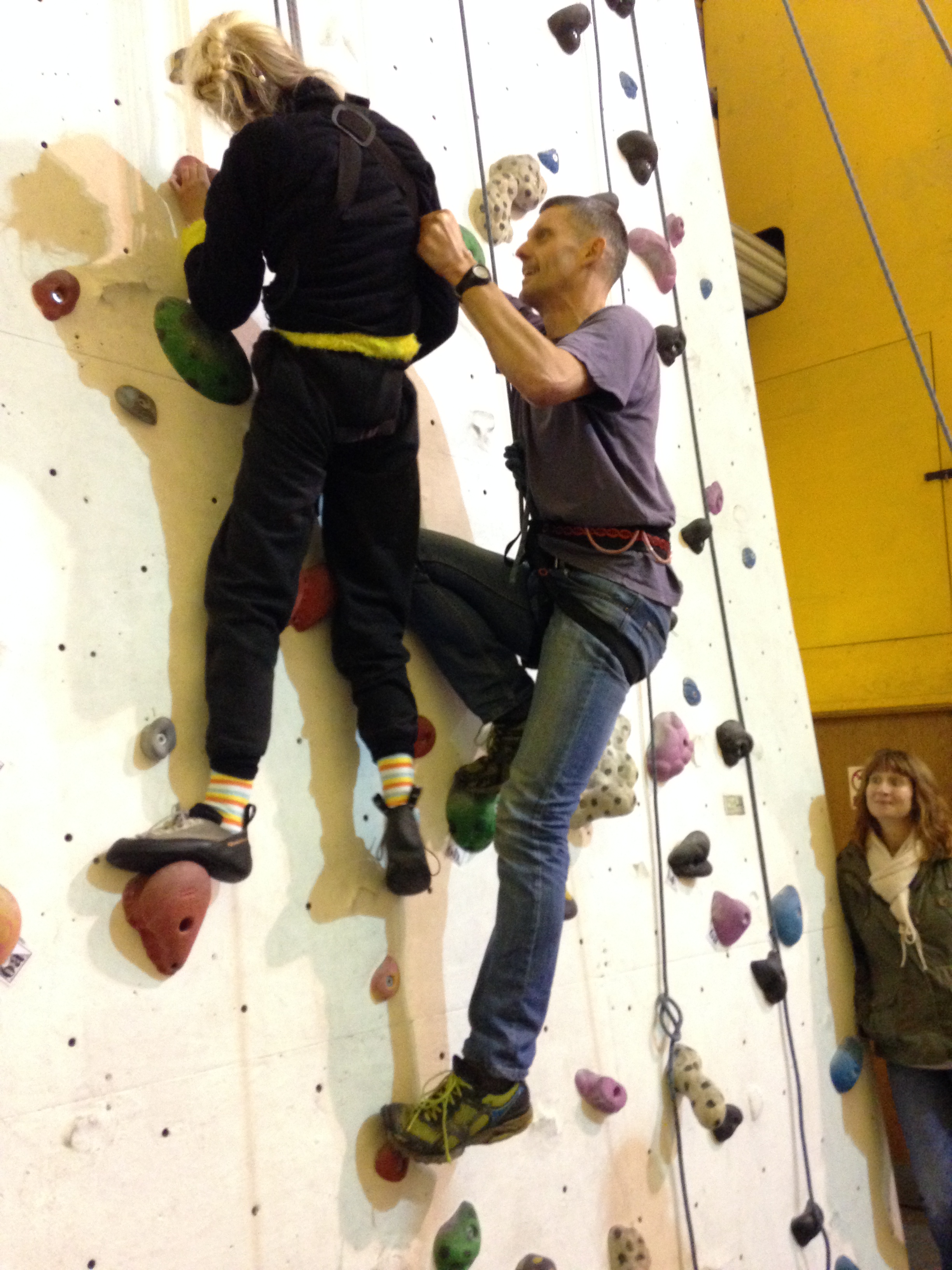 And so did another friend try climbing. A parapente harness worked well. Pics from that next time. And pics from Clare’s transition from full body harness onto a standard harness plus chest harness combo. New techniques …